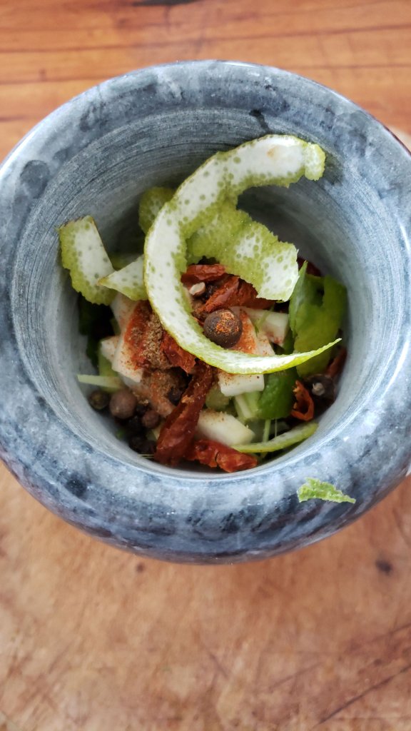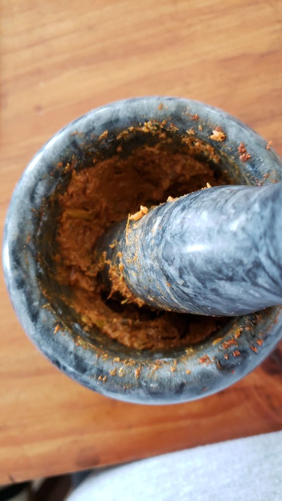 Estrené mortero de mármol, dispuse todos los ingredientes necesarios y comencé a moler despacio una y otra vez la mezcla hasta obtener la pasta de curry casera.